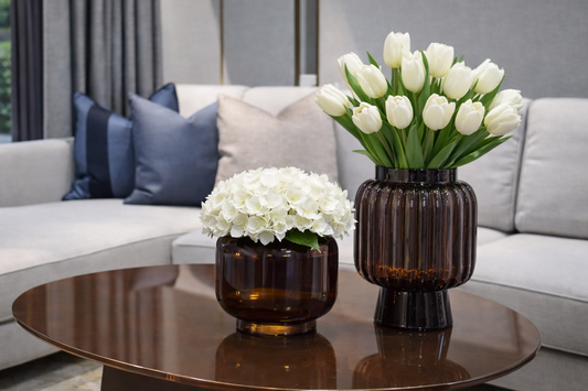 Brown Glass Vase with Hydrangea Flowerفازة زجاج لون بني مع ورد هدرانجيا