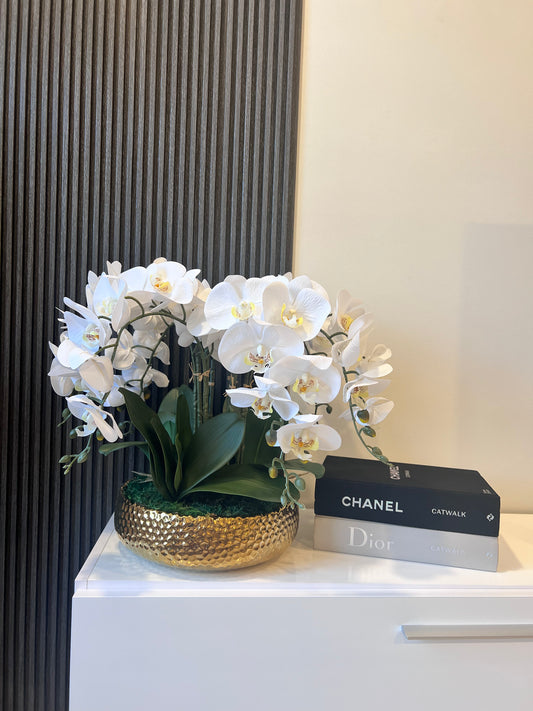 Gold Vase Orchid Arrangement فازة سيراميك لون ذهبي مع تنسيق ورد الاوركيد الاصطناعي