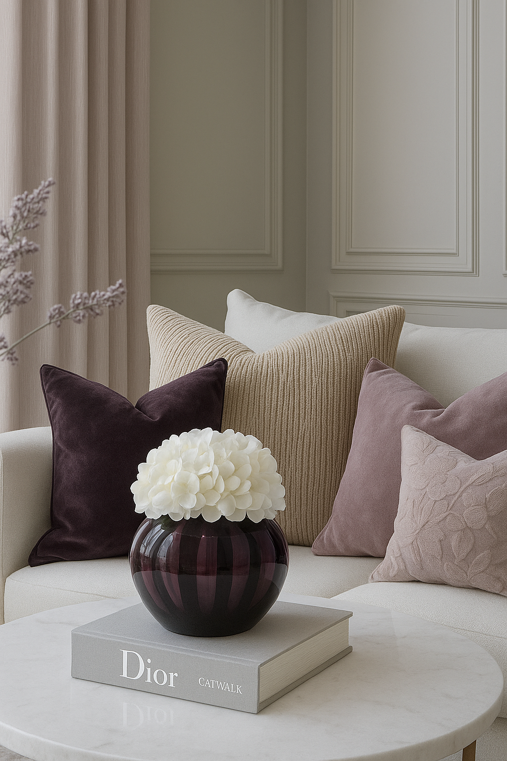 Purple Ruby Glass Vase with hydrangea artificial flowers